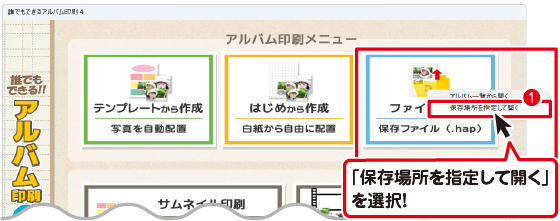 「アルバムを開く」画面が表示されますので、「保存場所を指定して開く」