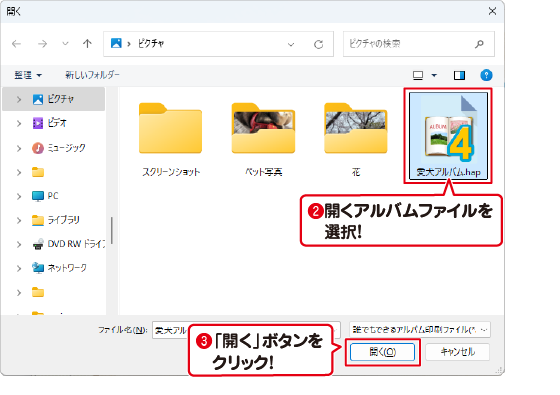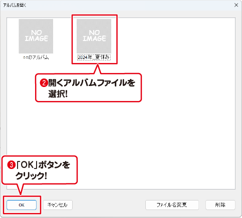 「アルバムを開く」画面が表示されますので、開くアルバファイルムを選択します。