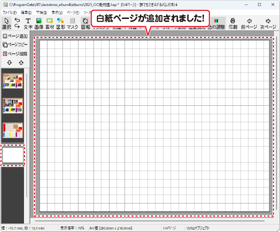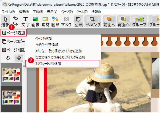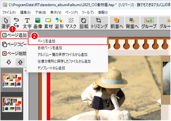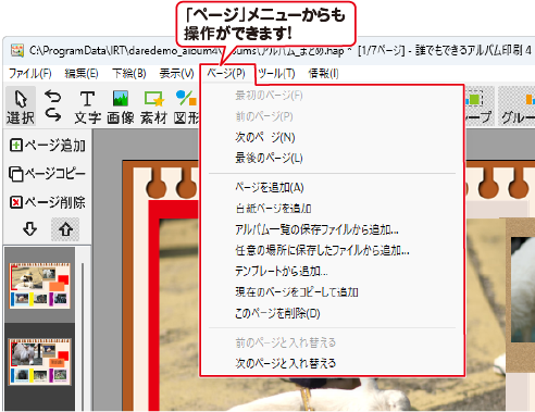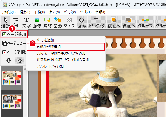 「ページを追加」「白紙ページを追加」「アルバム一覧の保存ファイルから追加」