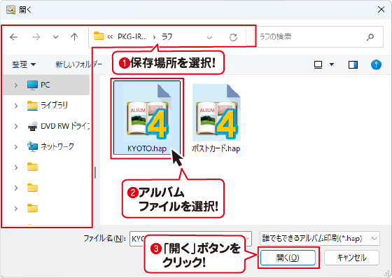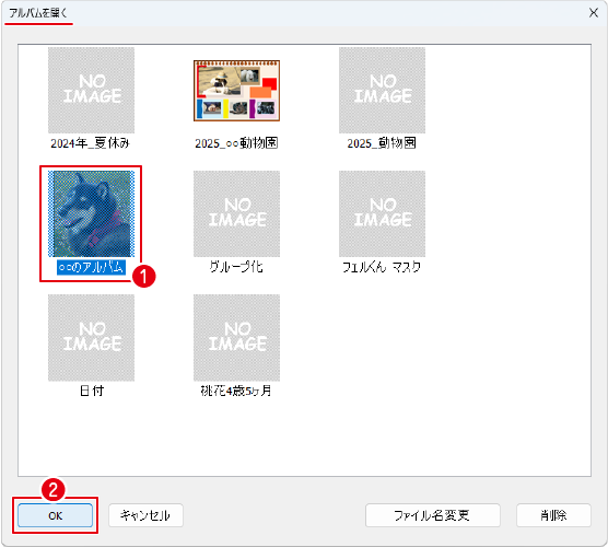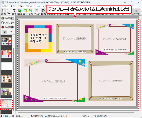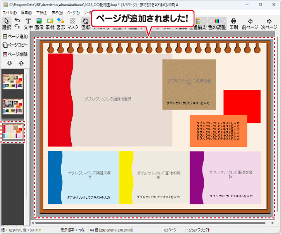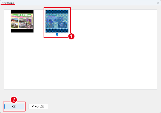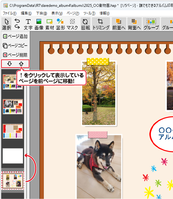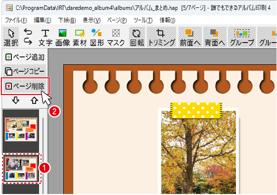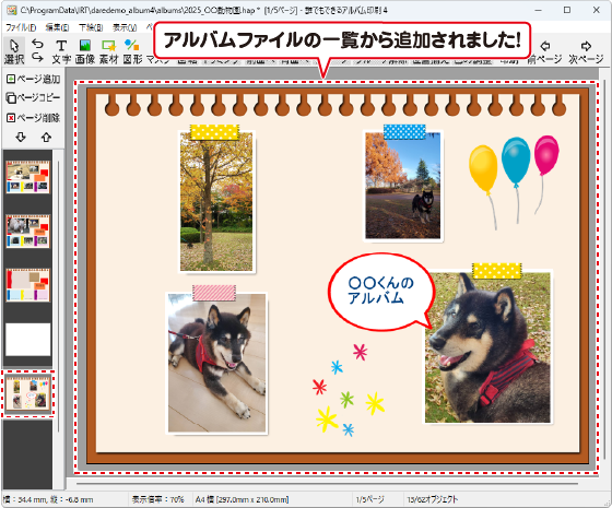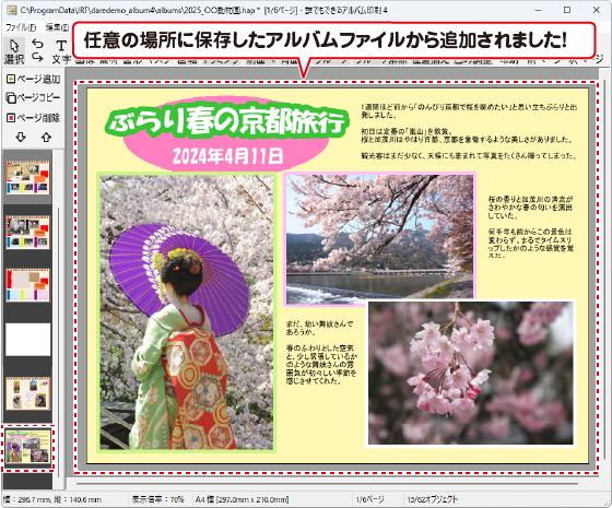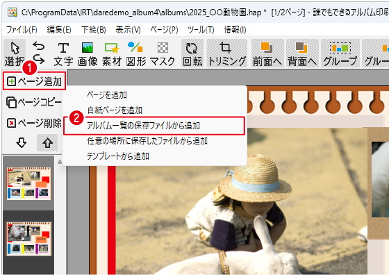 「ページ追加」をクリックし、「アルバム一覧の保存ファイルから追加」を