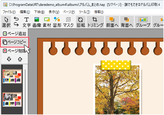 「ページ」メニューから「現在のページをコピーして追加」を選択します。