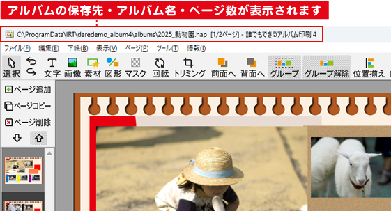 画面上部に、アルバムの保存先・アルバム名・ページ数が表示されます。