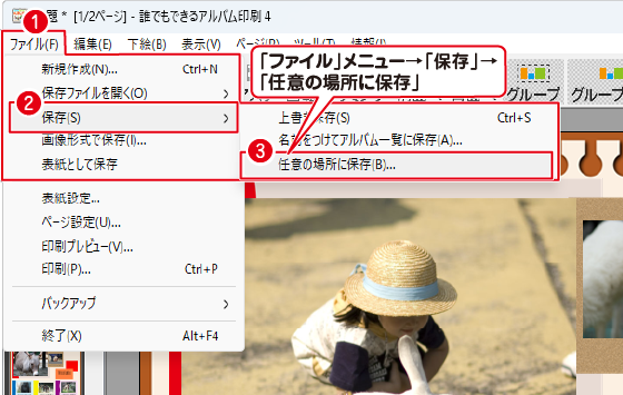 「ファイル」メニューから「保存」→「任意の場所に保存」を選択します。