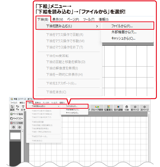 例:「下絵」メニューから「下絵を読み込む」→「[ファイルから」を選択します。