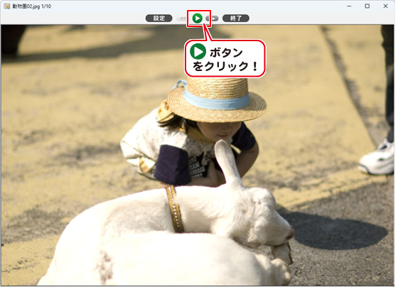 スライドショー画面に写真が読み込まれましたら、ボタンをクリックして