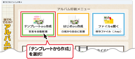 「アルバム作成」画面で、「テンプレートから作成」ボタンをクリックします。