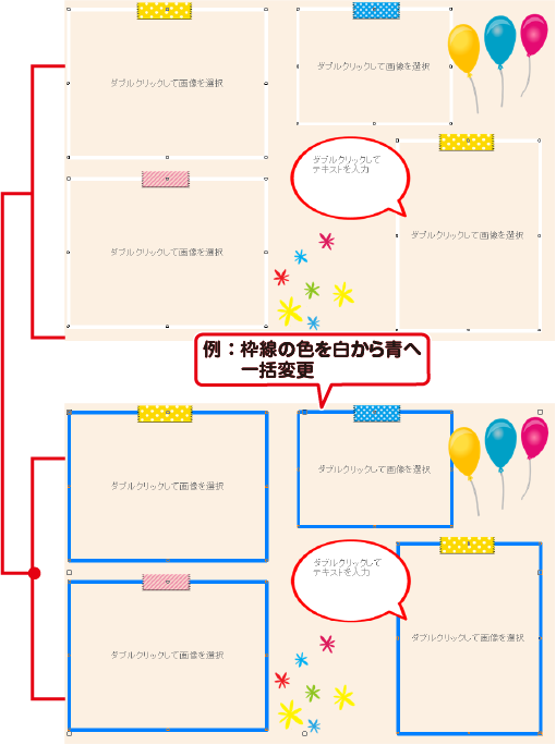 「写真上への日付表示」「写真枠の設定」「写真枠のふちぼかしやドロップシャドウ」の各種設定が複数写真にまとめて設定できるようになりました。