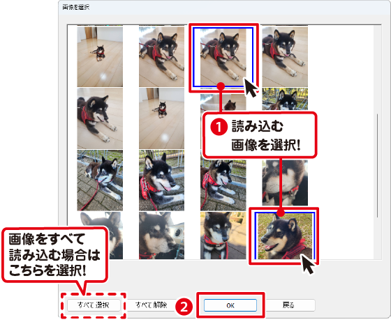 配置する写真をクリックして選択、またはすべて選択ボタンをクリックします。