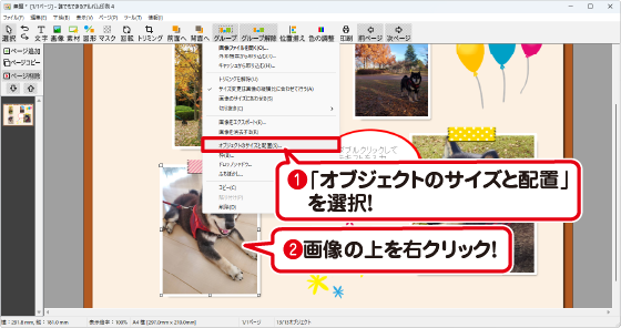表示されるメニューから、「オブジェクトのサイズと配置」を選択します。