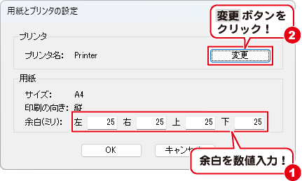 変更ボタンをクリックして用紙とプリンターの設定をします。