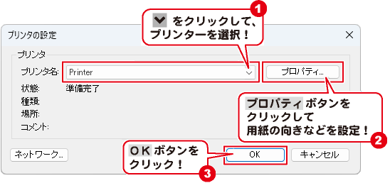 プロパティボタンをクリックすると、お使いのプリンターの設定画面が表示されますので、用紙の向きや出力紙の指定、両面印刷の設定などを行います。