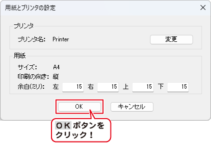 用紙とプリンタの設定画面に戻りましたら、OKボタンをクリックします。