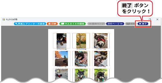 サムネイル印刷を終了する時は、「 終了」ボタンをクリックします。