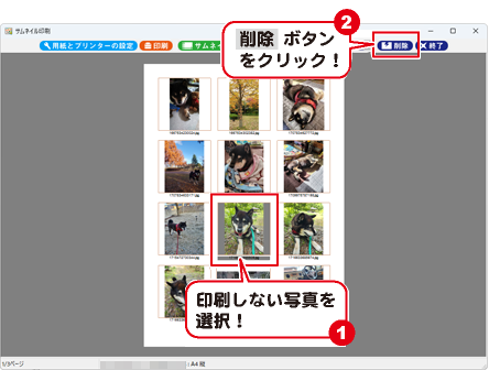 読み込んだ写真の中から、印刷しない写真を選択して「削除」ボタンを