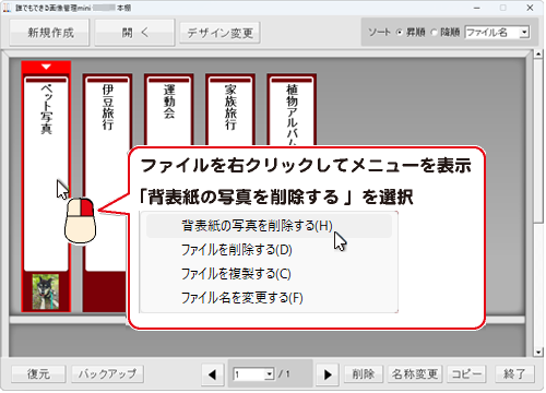 右クリックメニューが表示されますので、「背表紙の写真を削除する」を選択してください。
