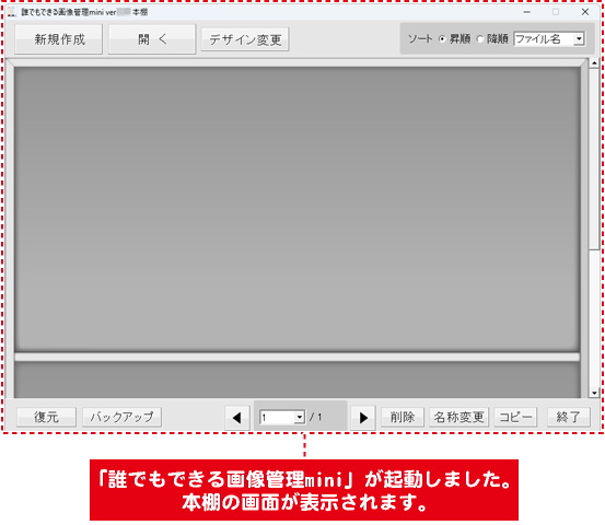 「誰でもできる画像管理mini」が起動すると、下のような本棚の画面が表示されます。