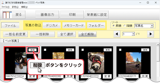 ファイルを開いて、登録している写真を表示します。 削除したい写真の右上にあるをクリックします。