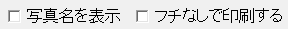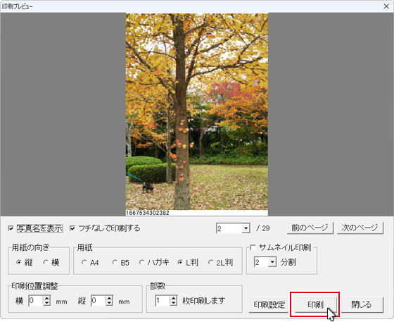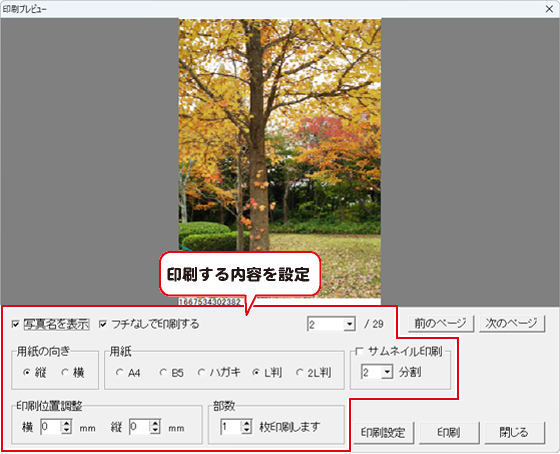 ①写真名の印刷の有無、フチあり・なしの印刷を設定します。