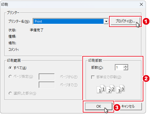 プロパティボタンをクリックして、プリンターの詳細設定をします。