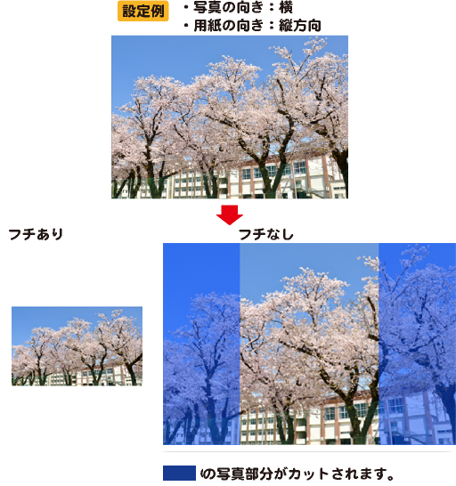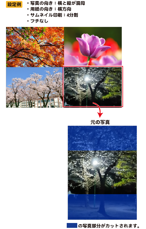 「フチなしで印刷する」を設定すると、サムネイル印刷の分割数、用紙の向き、写真の向きによって、写真の一部がカットされる場合があります。