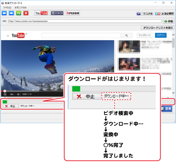 インターネット環境等が正常に動作(及び接続)されていない場合やYouTube、ニコニコ動画、USTREAM、FC2動画のシステム改変が行われた場合、また公開されている動画の構成によってはダウンロード及び変換作業等が行えない場合があります。