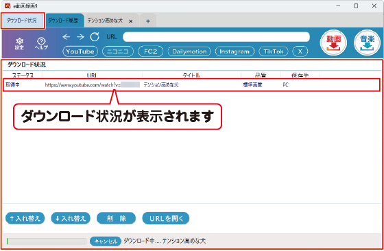 | ダウンロード状況リストから選択して動画のURLを開きます。 | |