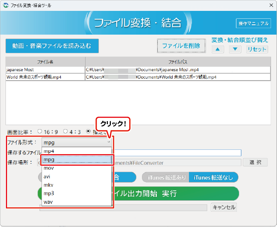 ※結合する中にMP3 / WAV形式のファイルがある場合、MP3 / WAV形式での