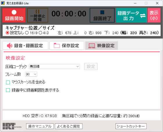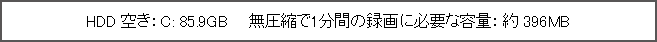 HDD空き ソフト起動時のHDDの空き容量を表示します。 無圧縮で1分間の録画に必要な容量 1分間の録画に必要なおおよその容量を表示します。 |
