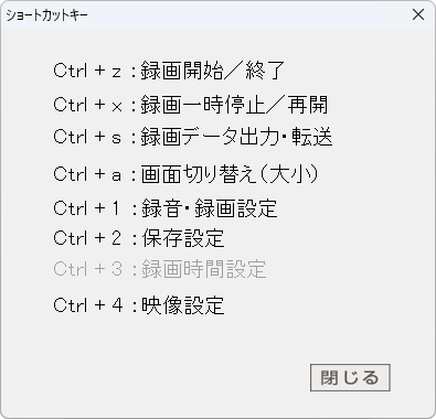 マウス操作の他にショートカットキーで、録画の開始や 終了の設定画面の操作ができるようになりました。 行えます。