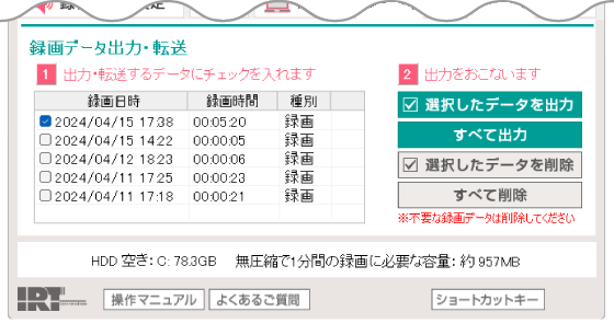 「録画日時」列の左端にある□をクリックして、保存・転送するデータにチェックをいれます。 |
