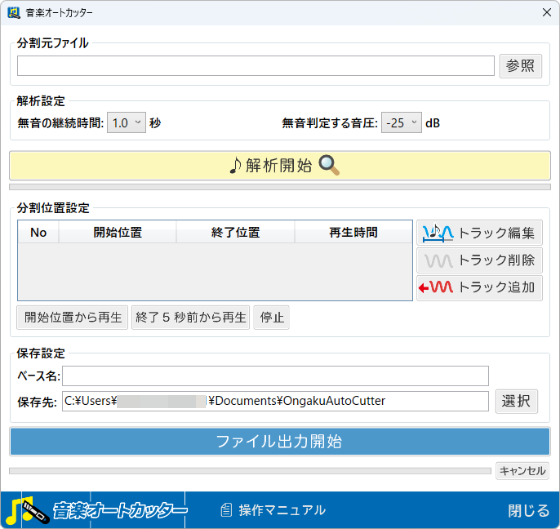 | 分割元ファイルを解析して、トラックに分割します。 | |
