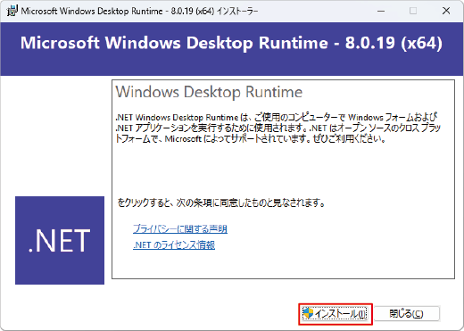 Microsoft Windows Desktop Runtimeのインストール画面が