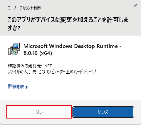 ユーザーアカウント制御が表示されましたら、「はい」をクリックします。