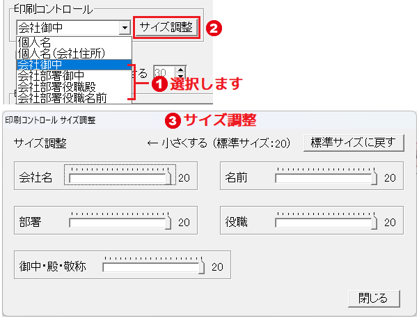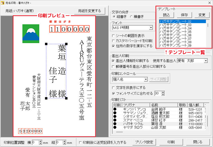 名前、住所の印刷配置や文字の大きさを調整することができます。
