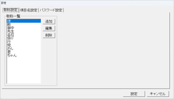 敬称は住所録一覧画面、名前(個人名) の右側「▼敬称」で選択したものが印刷されます。