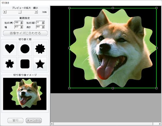 切り抜く形、枠の位置を設定して、画像を切り抜きます。