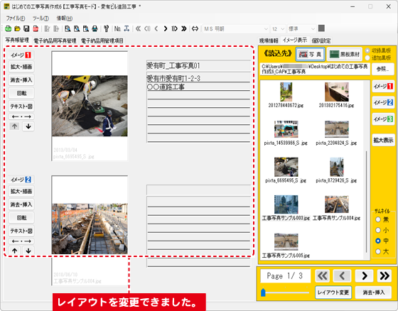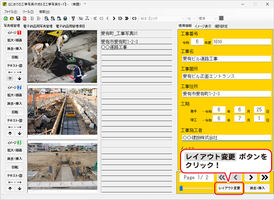 レイアウト変更 ボタンクリックして、ページレイアウト変更画面を表示します。