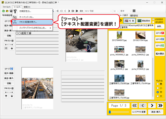 ページ単位で設定したい場合は、メニューバーの[ツール]→[テキスト配置変更]を選択すると、テキスト位置変更画面が表示されます。