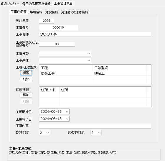 CORINSの「工種、工法・型式」の「工種」及び「工法・型式」を入力します。(複数記入可)