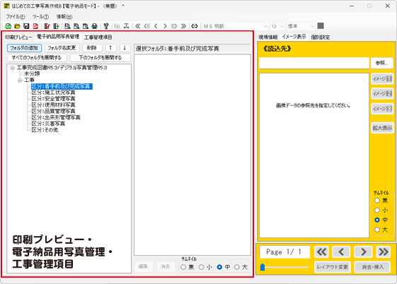 下のような画面が表示されます。※説明のない箇所については、工事写真モード(メイン画面)の説明をご参照ください。