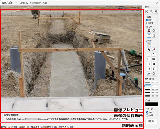 ボタンをクリック後、画像プレビュー上で切り抜きする範囲をドラッグ&ドロップします。 写真の一部を切り抜いて拡大表示します。 トリミング領域の情報を削除して、トリミング前の画像に戻ります。 トリミングした画像に描画したデータは削除されます。 写真の一部を横写真サイズに切り抜いて拡大表示します。 写真の一部を縦写真サイズに切り抜いて拡大表示します。 |