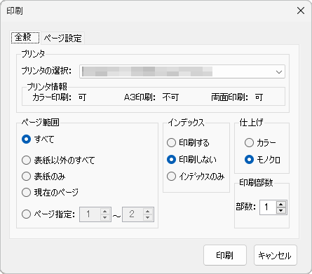 選択しているプリンターがカラー印刷、A3サイズ印刷、両面印刷をサポートしているかを表示します。