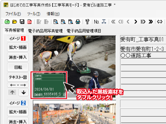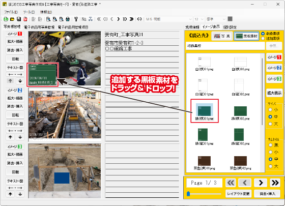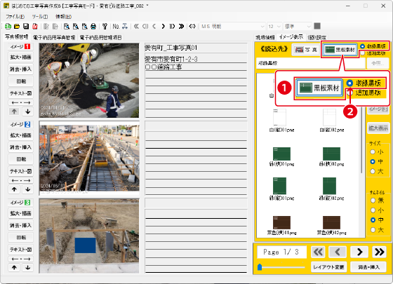 (オリジナルの黒板素材を工事写真に取込む操作は こちら から)