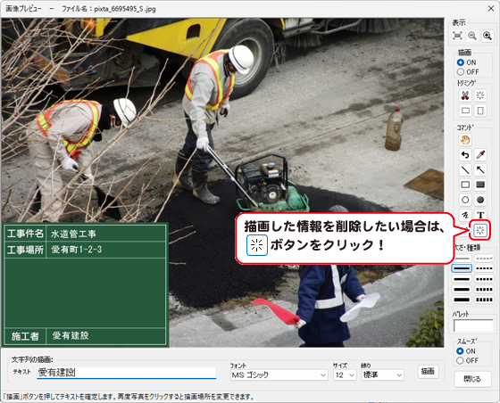 文字を入力し[描画]ボタンをクリックして確認後、画面を閉じます。