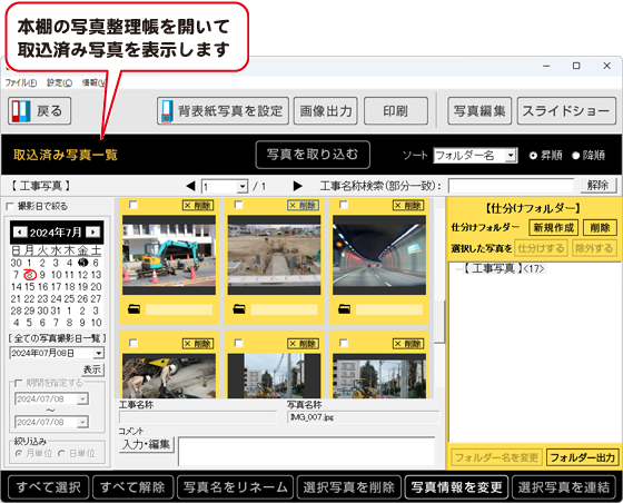 本棚の写真整理帳を開いて、取込済み写真一覧を表示します。