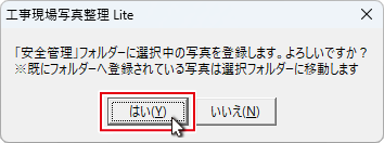 確認画面が表示されますので、選択しているフォルダーに写真を登録する場合は、はいボタンをクリックします。