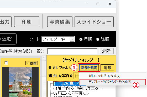 新たに写真整理帳を作成した時など、登録したテンプレートを呼び出してかんたんにフォルダーを作成することができます。