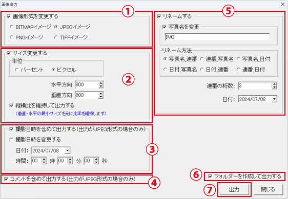 写真整理帳に取り込んでいる写真サイズ、画像形式を設定して出力することができます。