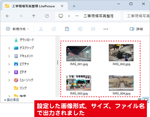 下図例では、「IMG_001……IMG_999」と、リネームされます。