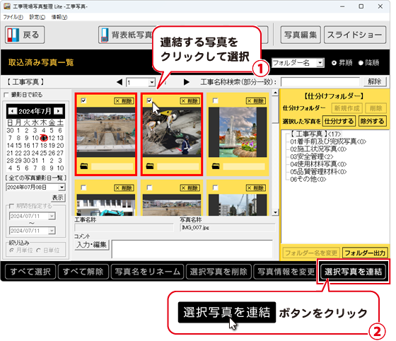 ①連結する写真をクリックして選択します。(複数選択してください)